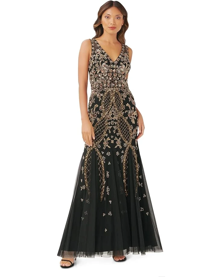 Adrianna Papell V-Neck Fully Beaded Long Gown