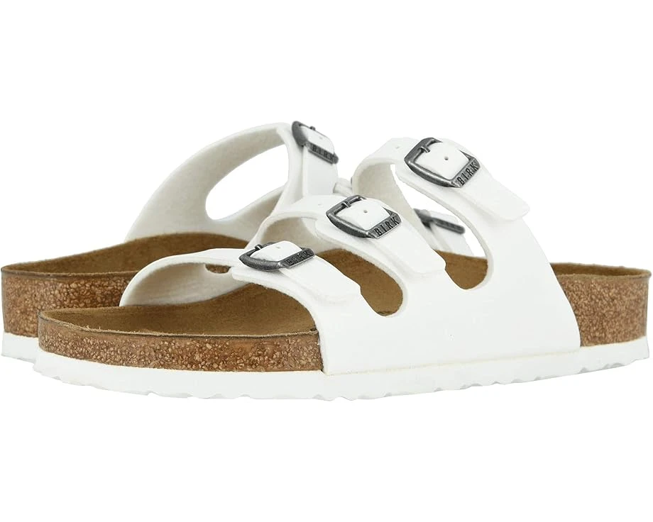 The Birkenstock® Florida Birko-Flor™ is a fabulous triple-strap sandal that offers security and style.SKU: #9456649Crafted in genuine Birko-Flor™ upper with fully adjustable buckles for the perfect fit.Anatomically correct cork footbed, crafted from cork that is 100% renewable and sustainable, encourages foot health.The suede-lined anatomically-shaped cork and latex footbed will mold to the shape of your foot creating a custom footbed that supports and cradles you each and every step.Raised toe bar is designed to encourage the natural gripping motion of your feet, exercising your legs and aiding circulation.Neutral heel profile and deep heel cup keeps the natural padding of your foot where it belongs – under the heel, distributing your body weight more evenly.Flexible EVA outsole offers lightweight, shock absorbing support with lasting durability.Dual layer Jute top wicks away moisture while the bottom adds strength and makes resoling easy.You will enjoy your Birkenstocks for years because they can be repaired, resoled or even completely renewed.Heat Warning – Cork footbeds or EVA soles can be damaged by exposure to concentrated heat. Do not leave your footwear in direct sunlight or in closed cars on warm days. If your footwear becomes wet, allow it to air dry slowly, away from direct heat.Made in Germany.