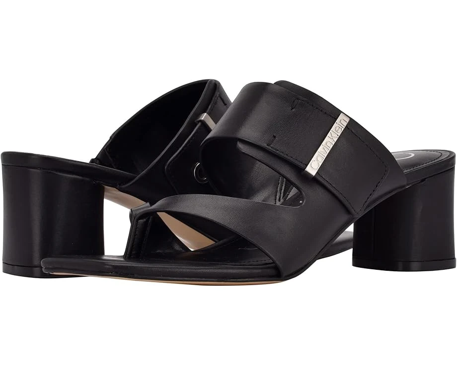 Take the streets by storm with the Briella heels from Calvin Klein™!SKU: #9729188Leather upper.Slide on style with single toe post. Multiple straps on top of foot with open toe design. Square toe silhouette. Branded hardware on straps. Synthetic lining and footbed.Covered block heels.Synthetic outsole.Imported.Product measurements were taken using size 8, width M. Please note that measurements may vary by size.Weight of footwear is based on a single item, not a pair.Measurements: