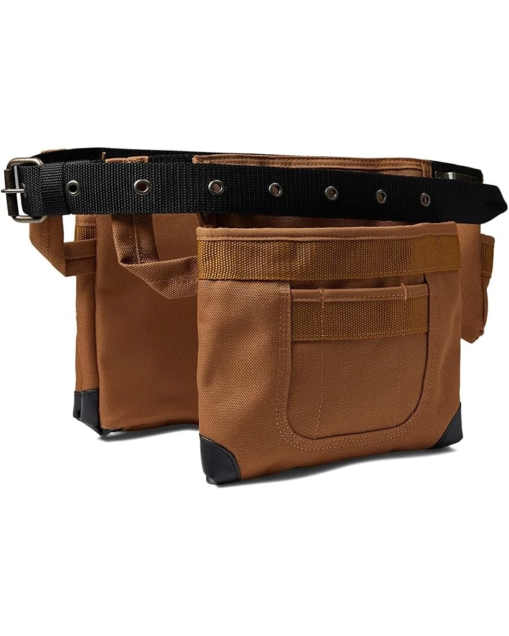 Safely carry all your tools in the durable Carhartt® Seven-Pocket Tool Belt and have anything you need at your hands reach.SKU: #9790142Constructed from 1200 denier polyester with Rain Defender® durable water repellent and Duravax™ abrasion-resistant corners.Open top for easy access.Nine pockets and six loops with two removable pockets.Metal hammer hook.Metal tape measure holder.Two loops for hanging the belt when not in use.Padded and contoured buckled waist belt fits up to a 52-inch waist.Brand tag on the front slip.Polyester lining. Imported.Measurements: