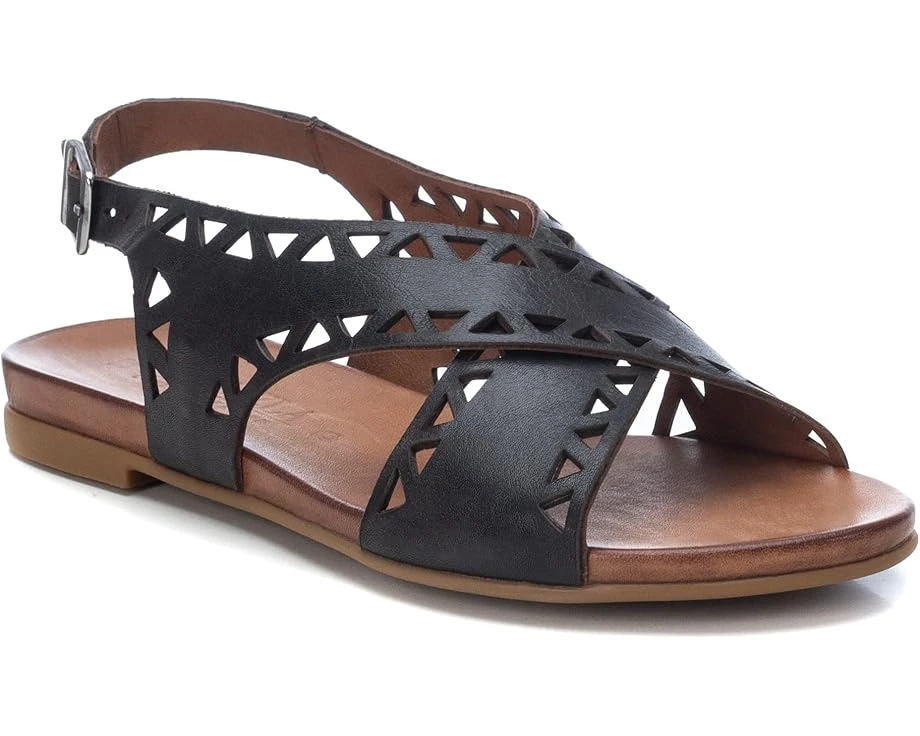 Give your feet a breathable and relaxed style wearing CARMELA® Clarisa footwear.SKU: #9795774Leather upper.Leather lining and insole.Open toe.Crisscrossed vamp and ankle-line.Adjustable ankle strap.Buckle closure.Flat platform.Triangle cut-out design for geometric look.Rubber midsole and outsole for traction and durability.Made in the Spain.Measurement: