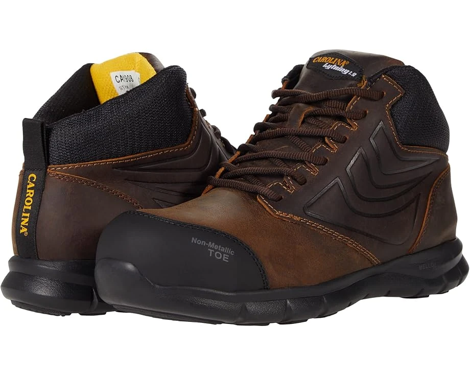 The Carolina® Lytning 1.9 Comp Toe is features the brand’s signature heavy duty construction, minus the metal toe cap.SKU: #9785274Style number: CA1905.Non-metallic composite safety toe that meets the ASTM F2412 -18a & ASTM F2413-18 Standards for compression and impact testing rating. Also features reduced cold-transfer in cooler environments.Electric Hazard Resistance testing ASTM F2412 -18a & ASTM F2413-18 and can withstand applications of 18,000 volts at 60hz for one minute without leakage.Mesh lining. Cement Construction.Lace-up closure.Low-cut fabric upper.Non-metallic safety toe cap.Removable AG8 Intelli/Sphere Polyurethane Dual-Density Foam Footbed.Mello/Sphere EVA Cushioning Midsole.Insole and outsole made of man-made material.Lytningâ„¢ Oil & Slip Resisting Outsole with Tech-Tonic Rubber Pads meets or exceeds ASTM F 1677 testing.Imported.Product measurements were taken using size 8, width D – Medium. Please note that measurements may vary by size.Weight of footwear is based on a single item, not a pair.Measurements: