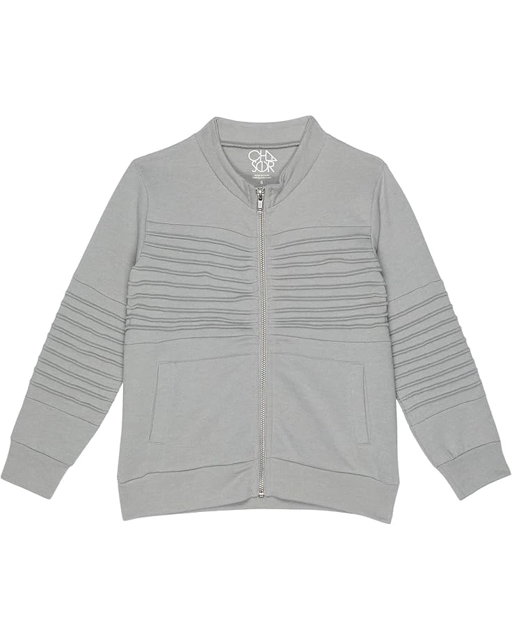 The primary materials that compose this product contain a minimum of 20 percent recycled content.SKU: #9787733Get a subtle touch of style wearing the comfy Chaser® Kids Mock Neck Moto Zip Jacket.Mock neck.Zip closure.Full sleeves with ribbed cuffs.Curved ribbed hem.Two slash pockets on the front.60% cotton, 40% recycled polyester.Machine wash, tumble dry.Imported.Product measurements were taken using size 6 Little Kid. Please note that measurements may vary by size.Measurements: