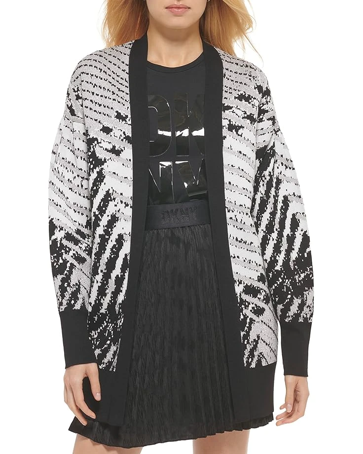 DKNY Long Sleeve Open Front Plaid Jacquard Lurex Cardigan