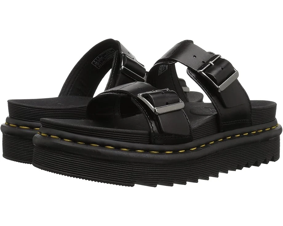 Be on the move all summer long with the tough yet supremely comfortable style of the Dr. Martens® Myles sandal. SKU: #8982368Brando leather upper is made of a full-grain waxy leather.Retains Doc’s DNA like grooved sides and yellow welt stitching.Two adjustable buckles for a preferred fit.Cushioned footbed with heel pad for added support and comfort. Goodyear® welted construction provides durability with an upper and sole that are heat-sealed and sewn together.Slight wedge and platform for an empowering boost.Built on the super-lightweight Ziggy outsole with a ripple tread.Imported.Product measurements were taken using size UK 13 (US Men’s 14), width Medium. Please note that measurements may vary by size.Measurements: