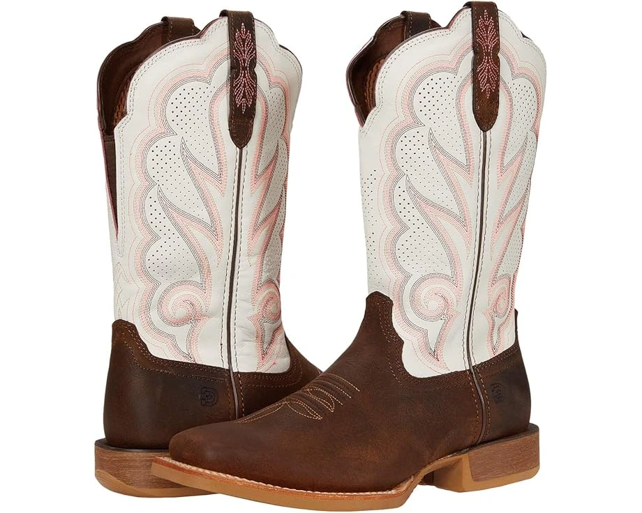 The Durango® Lady Rebel Pro™ White Ventilated 12″ cowgirl boots have a stylishly modern Western look with a breathable interior and an expandable shaft that will give you all the comfort, support, and stability you’d get in a classic cowboy boot. SKU: #9441933Two-tone full grain leather upper with the Durango® X-treme A.C.™ ventilated shaft to promote maximum airflow. Durango X-Pand System provides a universal fit for all calf sizes. It has a fully engineered design that includes a hidden elastic material located under each pull tab that expands an additional 2″ on each side for added room, comfort, and flexibility.Pull-on boot with stitched pull loops for easy entry. Breathable mesh lining for a comfortable fit.Durango X-treme Comfort Footbed features a memory foam that forms to the shape of your foot and has three times the flexibility, cushioning, and support of a classic insole. Wide square toe. Three-quarter genuine Goodyear® welt construction and a genuine leather welt with double-row cotton stitch. Fiberglass Dually Shank™ System is made of two fiberglass shanks that double the torsion stability and midfoot support. Rolled shank area.ABS heel base is nailed for lightweight durability. Rocker heel for excellent stability. Durable rubber outsole is oil, slip, and abrasion resistant. Imported.Product measurements were taken using size 8.5, width B – Medium. Please note that measurements may vary by size.Measurements: