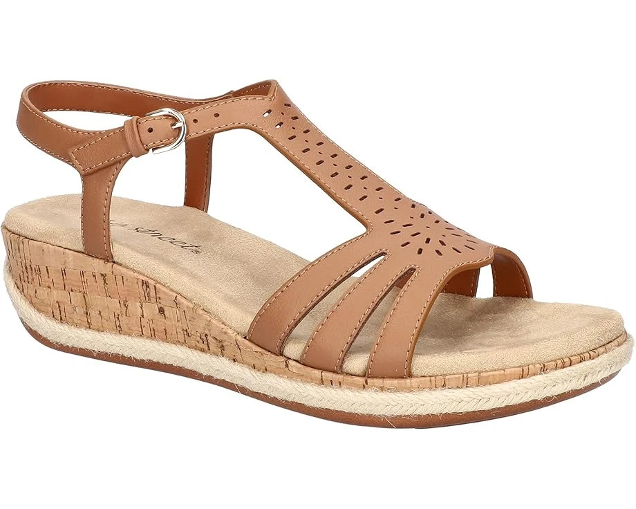 Look chic wearing the Easy Street® Dorinda wedge heels that feature padded insoles for enhanced all-day comfort.SKU: #9786811Man-made upper.Fabric lining.Foam footbed.Ankle strap with buckle closure.Open round toe.Cork inspired wedge heel.Broad vertical strap with intricate cutout detail.Branding detail on the footbed.Man-made outsole.Imported.Measurements: