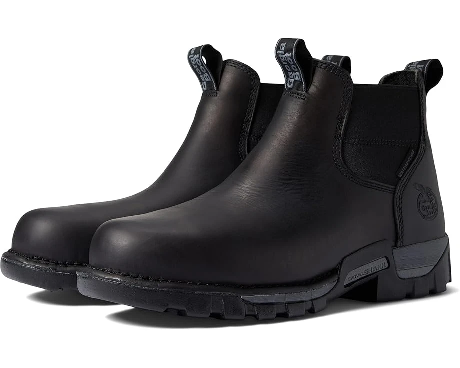 Give a durable protection to your feet, wearing Georgia Boot® Eagle One Steel Toe Chelsea.SKU: #9736682Leather upper.Textile lining.Removable Polyurethane/Foam insole.Pull-on style.Steel safety toe meets ASTM F2413-18/ASTM F2412-18a impact and compression, EH (Electrical Hazard) standard.Round toe.Crew height boot.Front and back shaft pull-tabs.Plain construction.Low block heel.Slip resistant synthetic lugged outsole passed ASTM F2913-19 standard.Imported.Product measurements were taken using size 9.5, width D – Medium. Please note that measurements may vary by size.Weight of footwear is based on a single item, not a pair.Measurements: