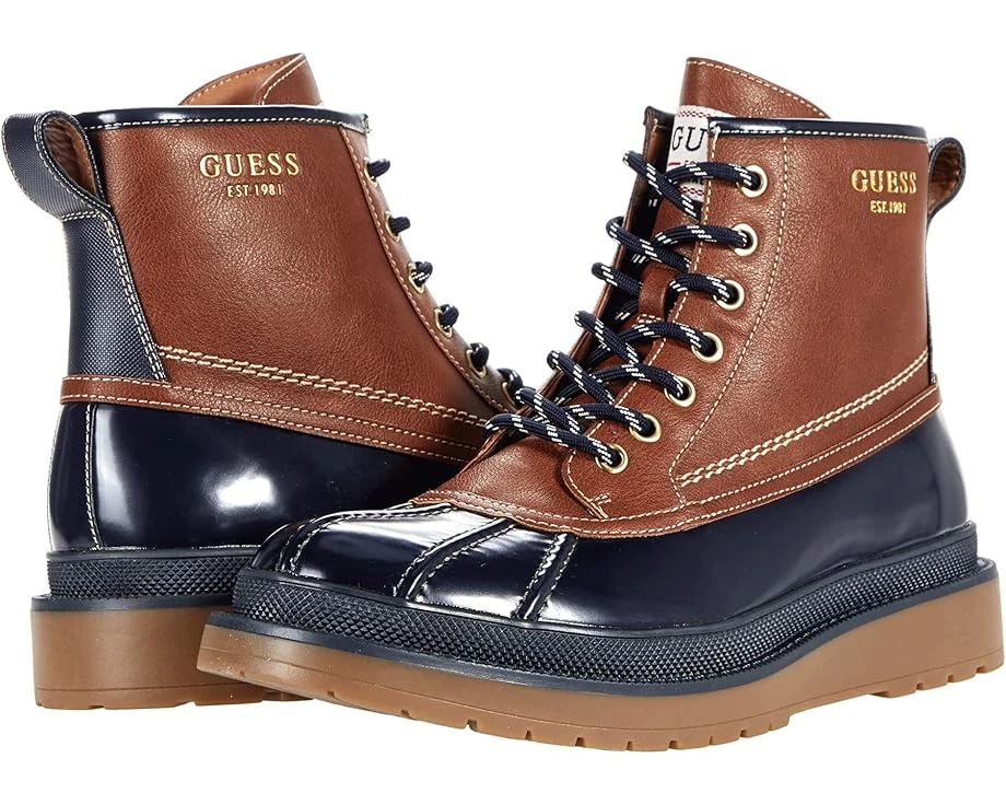 Welcome in the colder weather with the ankle length GUESS® Canfield boots.SKU: #9581664Pull-on styling with a classic lace-up closure. Multi-colored striped laces make for a fun look. Color-block design between the man-made upper and man-made outsole. Contrast stitching and the GUESS® logo on the upper. Pull-tab at the heel for easy on/off.Man-made lining and insole. Lug sole sits on a durable man-made outsole. Imported.Weight of footwear is based on a single item, not a pair.