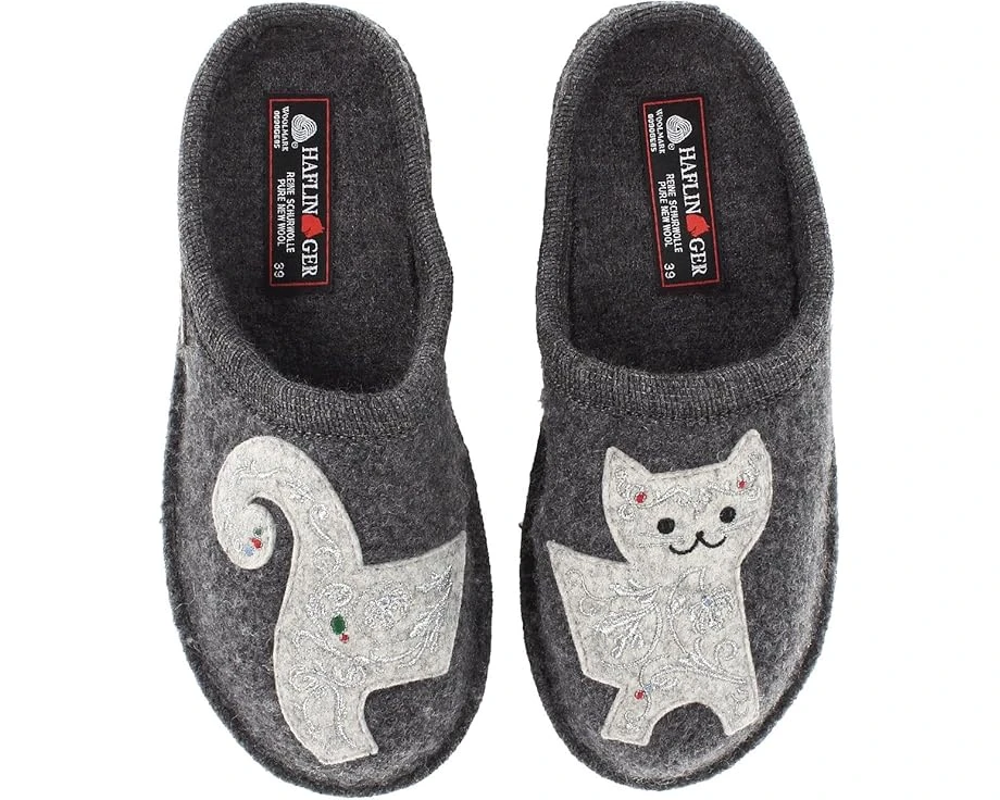 Perfect for the cat-loving lady, these Haflinger® slippers are cozy and styles for those days of lounging. Super cute cat appliqués adorn the front of each slipper.SKU: #8195169Boiled wool upper is naturally soft, sturdy, and machine washable.Warm wool-covered footbed is sure to massage your foot with each and every step. Latex arch support is sure to leave your feet feeling happy. Double-felt outsole adds both cushioning and traction on a variety of surfaces. Imported.Product measurements were taken using size EU 40 (US Women’s 9), width M. Please note that measurements may vary by size.Measurements: