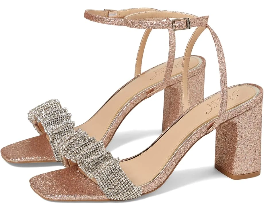 Elevate style and make a fine statement wearing Jewel Badgley Mischka® Rita Heels.SKU: #9839711Textile upper.Man-made lining and insole.Open squared toe.Embellishment on front strap.Glitter detailing allover.Ankle strap and buckle closure.Brand logo on insole.Block heel.Textile and synthetic outsole.Imported.Product measurements were taken using size 9, width M. Please note that measurements may vary by size.Measurements:
