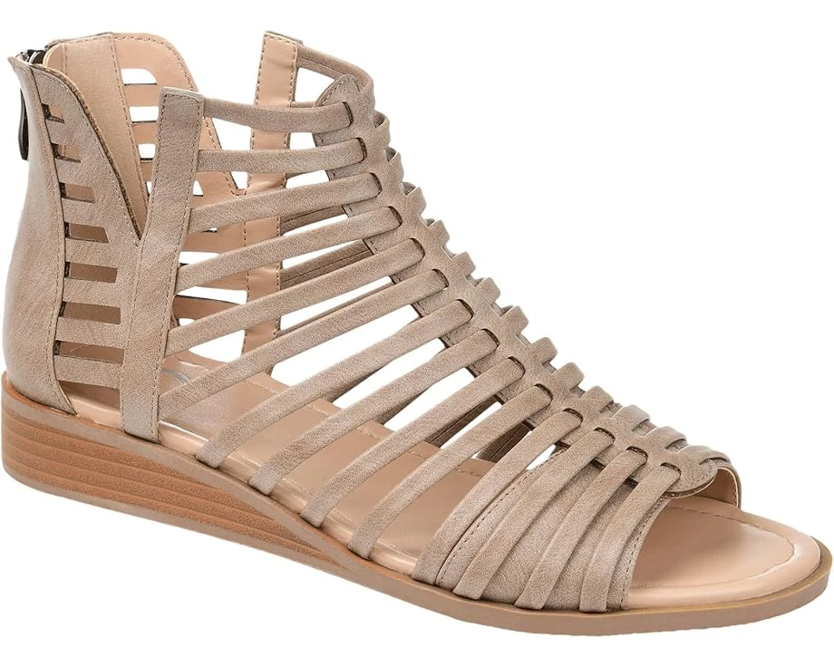 The Journee Collection® Comfort Foam™ Delilah Sandal is the perfect match for a tropical vacation or just getting out on the town. Showcasing a caged vegan leather upper with side “V” slit cutouts and back zip closure. SKU: #9503744Open-toe silhouette. 4 mm Comfort Foam® insole. Low wedge heel. Synthetic outsole. Imported. Product measurements were taken using size 8, width M. Please note that measurements may vary by size.Weight of footwear is based on a single item, not a pair.Measurements: