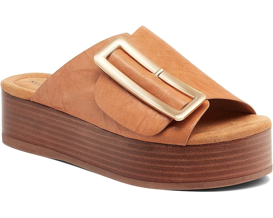 Look chic while offering utmost comfort to your feet wearing the Kelsi Dagger BK® Brooklyn Dover Platform Sandals.SKU: #9628426Vachetta leather upper.Synthetic footbed.Oversized decorative brass buckle on the upper. Open round toe and leather stacked platform heel.Rubbed and synthetic outsole.Imported.