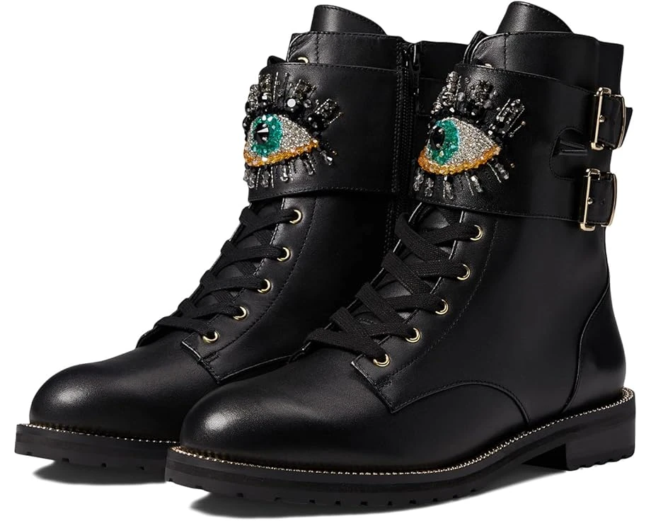 Add chicness to your stack by opting for the Kurt Geiger London™ Sutton Eye boots.SKU: #9841880Leather upper.Synthetic lining.Lace-up and zippered closure. Wide strap that is tied by two buckles and is embellished with eye motif comprising of multiple crystals. Concealed inner side zip with leather pull tab. Rubber sole. Imported.Product measurements were taken using size EU 40 (US Women’s 9), width M. Please note that measurements may vary by size.Measurements: