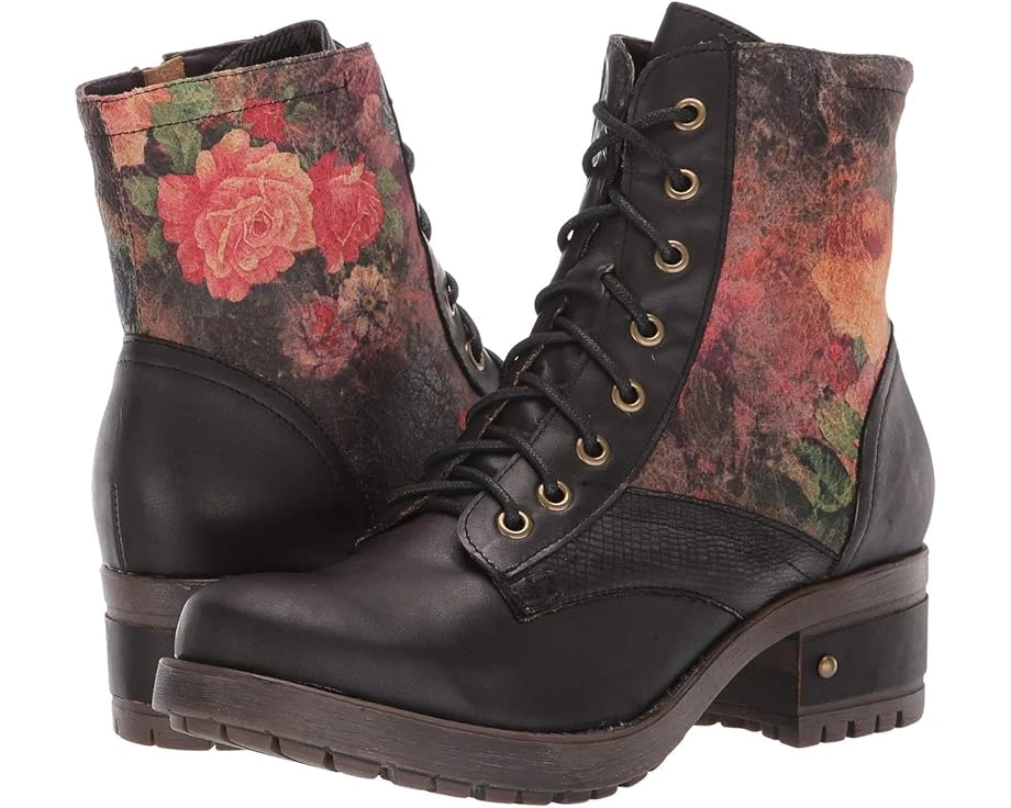 Please note that due to the unique hand-painted design of L’Artiste by Spring Step® footwear, the exact design may vary from piece to piece.SKU: #9108774The leaves are starting to turn, your latte is full of flavor, your Marty L’Artiste by Spring Step® are comfortable and bright. Combat boots in a floral-printed leather and woven textile upper.Eye catching chevron and striping pattern.Side zipper and front lace closure for optimal fit.Soft flannel lining. Lightly padded flannel insole.Block heel with lug rubber outsole. Imported.Product measurements were taken using size EU 40 (US Women’s 9), width M. Please note that measurements may vary by size.Measurements: