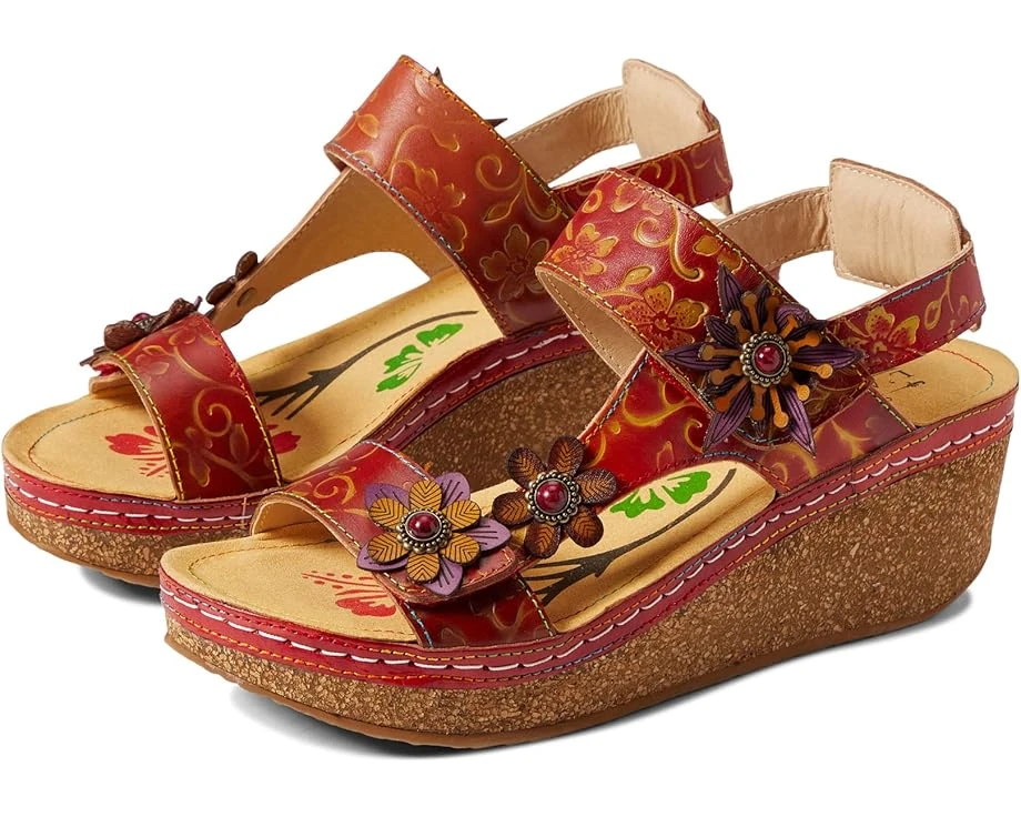 Please note that due to the unique hand-painted design of L’Artiste by Spring Step® footwear, the exact design may vary from piece to piece.SKU: #9670794L’Artiste by Spring Step® Pickford sandal gives you a perfect pop of color while being extremely comfortable all day long. Leather upper. Man-made lining and insole. Round open toe.Padded footbed ensure maximum comfort.Padded back strap.Hook-and-loop closure.Wedge heel. Spring-inspired flowers accentuates the upper strap. Man-made sole. Imported.Single footwear weight: 9 oz.Product measurements were taken using size EU 40 (US Women’s 9), width M. Please note that measurements may vary by size.Weight of footwear is based on a single item, not a pair.Measurements: