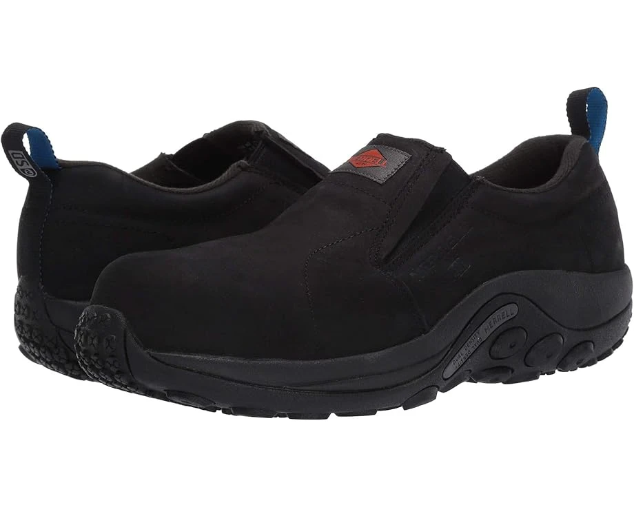 The Merrell® Work Jungle Moc Leather Moc Composite Toe SD+ work shoe combines a durable leather construction, superior static electricity protection, and reliable interior comfort to keep you moving in total confidence all day long. SKU: #9389497Part of the Merrell Work Collection.Slip-on work shoe with lightweight, non-metallic composite safety toe that meets ASTM F2413-11 I/75 C/75, ASTM F2412-11 Static Dissipative (SD) safety standards.Waterproof full grain leather upper. Protective, abrasion-resistant rubber toe cap. Heel pull tab. Padded mesh collar for added comfort. Breathable mesh lining offers a great in-shoe feel. KINETIC FIT™ Advanced contoured footbed with zonal arch support and heel cushioning for daylong comfort. Air cushioning in the heel absorbs impacting shock and adds stability. Molded nylon arch shank supplies flexible support. M Select™ GRIP rubber outsole with 3mm lug depth offers excellent traction and grip on various surfaces. Heat-resistant outsole provides protection for brief periods of direct contact with temperatures that meet or exceed 500°F.Outsole is oil and slip resistant and is Mark II tested.Imported. Product measurements were taken using size 10, width M. Please note that measurements may vary by size.Measurements: