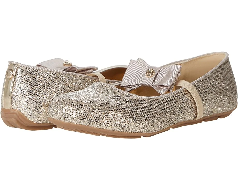 The MICHAEL Michael Kors® Kids Rover Day flat is an ultra-girly yet sporty style that’s perfect for her school day.SKU: #9205960Metallic man-made upper with an elastic strap and bow.Gold-tone brand logo hardware.Lightly padded man-made lining and footbed.Durable man-made outsole.Imported.Product measurements were taken using size 2 Little Kid, width M. Please note that measurements may vary by size.Measurements:
