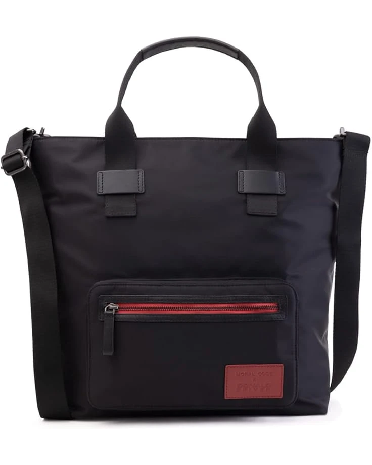 Get the perfect mix of convenience and style by carrying the Moral Codeâ„¢ Donald Driver Courage Tote Bag.SKU: #9872753Premium water-resistant nylon construction.Zippered closure.Removable shoulder strap.Two leather reinforced carry handles.One zippered exterior pocket.One zippered interior pocket.Two slip pockets inside.Red, Donald’s trademark color, offers a dash of pigment.Cotton lining.Imported.Measurements: