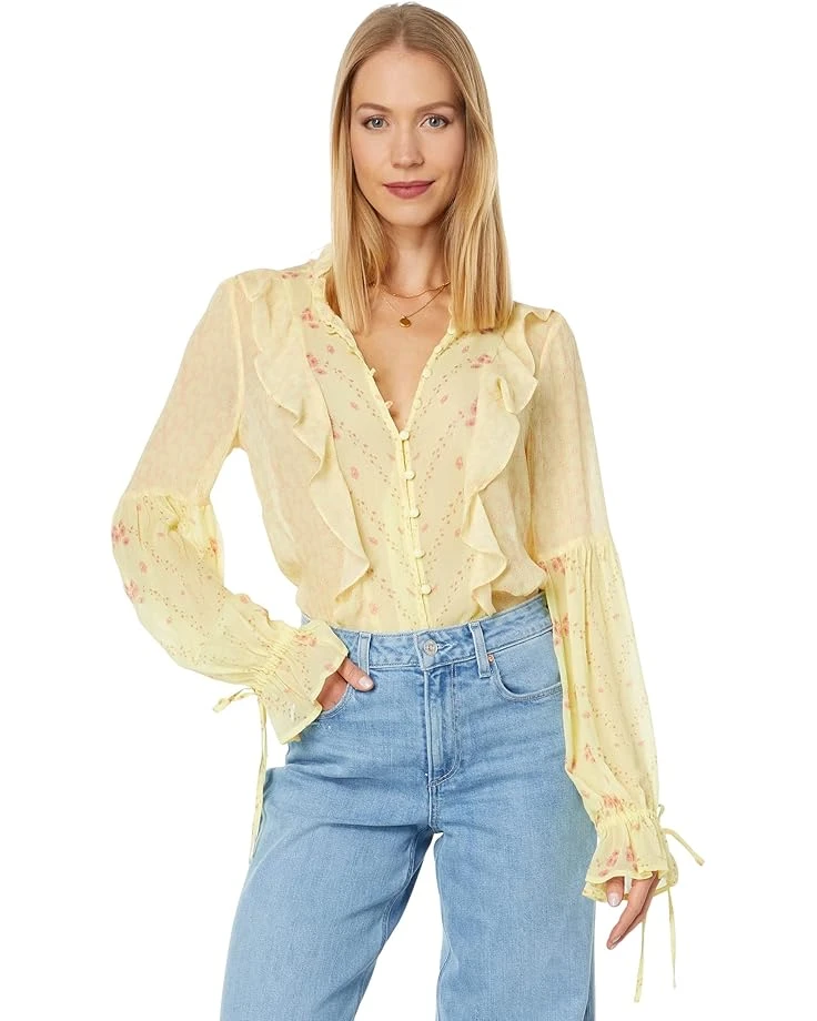 Flaunt an exquisite vibe and make a statement wearing Paige® Haiku Blouse.SKU: #9849925Relaxed fit.V-neckline.Ruffles down the center.Long sleeves.Ruffle cuffs with tie details.Self-covered button closure.Floral print allover.100% silk.Dry clean.Imported.