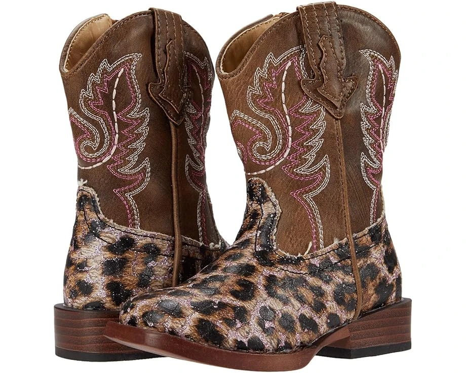 Your little cowgirl will get to steppin’ in savvy style with the modern Roper® Kids Cowbaby Glitter Leopard boots. These man-made boots feature a color-blocked shaft with colorful stitching on the shaft. SKU: #9386523Mid-calf boots feature a side panel zipper opening, boot-pull sides, soft man-made lining, and a cushioned footbed. A split-sole rubber outsole provides additional grip and traction for every step.Imported.Product measurements were taken using size 5 Toddler, width M. Please note that measurements may vary by size.Weight of footwear is based on a single item, not a pair.Measurements: