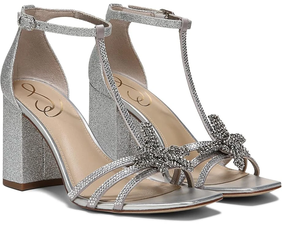Make every step elegant and classy wearing Sam Edelman® Donnie heeled sandals with eye-catching rhinestone detailing throughout.SKU: #9843509Fabric upper.Synthetic lining.Polyurethane footbed.T-strap design with buckle closure on ankle strap.Open, squared-toe silhouette.Elegant block heel.Synthetic outsole.Imported.