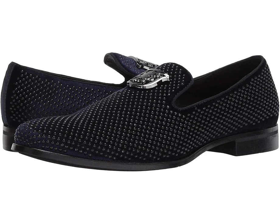 Leave them speechless. Punch up the posh with the edgy and elegant Stacy Adamsâ„¢ Swagger Studded Ornament Loafer.SKU: #9098539Velvet upper with polished metallic stud detailing.Slip-on construction.Rounded toe.Branded vamp accent.Complementary stripe at heel panel.Textile lining.Cushioned memory foam footbed.Stacked heel.Man-made outsole.Imported.Product measurements were taken using size 12, width D – Medium. Please note that measurements may vary by size.Weight of footwear is based on a single item, not a pair.Measurements: