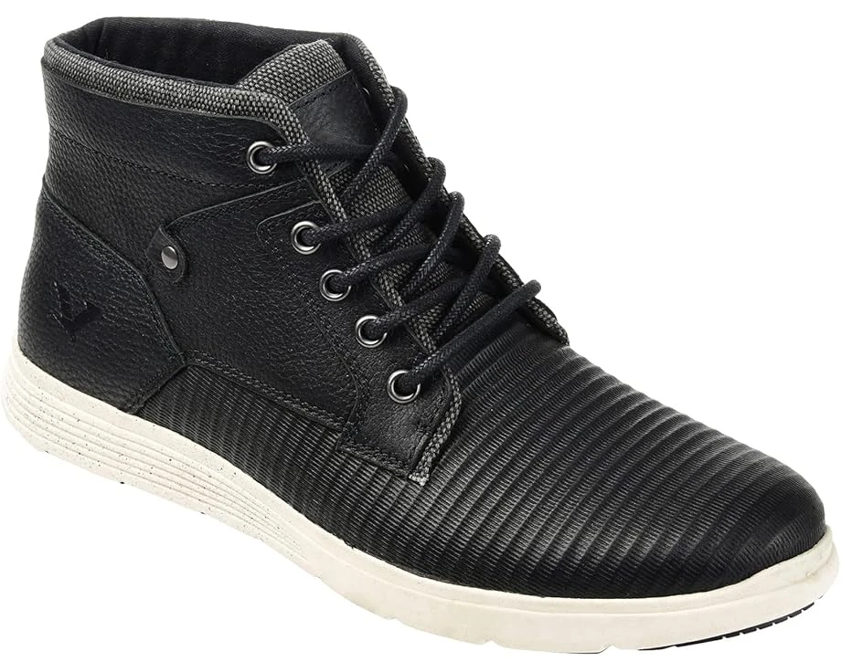 Easily make the transition from the office to happy our with the chic style of the Territoryâ„¢ Boots Magnus Casual Leather Sneaker Boot.SKU: #9589721Ankle boot-inspired sneaker silhouette with full-lace closure.Padded tongue and collar for comfortable fit.Embossed leather and canvas upper with round laces and metal eyelets.Breathable textile mesh lining.Synthetic padded insole.Lightweight synthetic outsole, textured for grip.Imported.