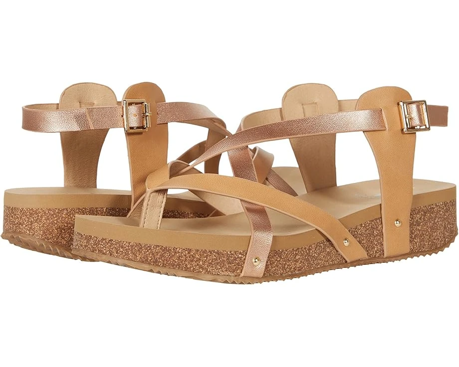 Step out in style in the VOLATILE™ Engie with a mix of neutral and metallic vegan leather that will become your warm weather staple. The low platform wedge adds a subtle lift while offering stability, perfect for dressing up weekend wear or keeping fashionably comfortable at the next outdoor party. SKU: #9580035 Strappy thong sandal style.Ankle strap with adjustable buckle closure.Ultra comfort EVA insole.Low platform wedge. Rubber traction outsole.Synthetic upper.Synthetic lining and insole.Imported.Product measurements were taken using size 9, width M. Please note that measurements may vary by size.Measurements: