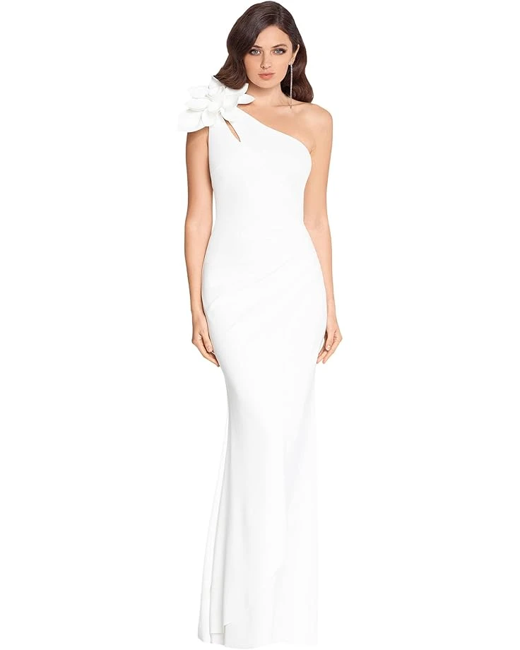 XSCAPE Long Scuba Ruched One-Shoulder Flower